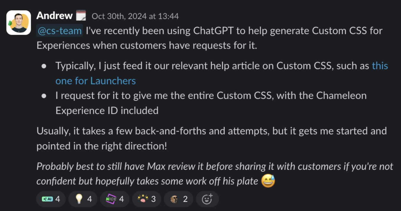 from our own team at Chameleon, using ChatGPT to quickly generate scoped CSS for in-app Experiences, skipping the usual ticketing flow entirely.