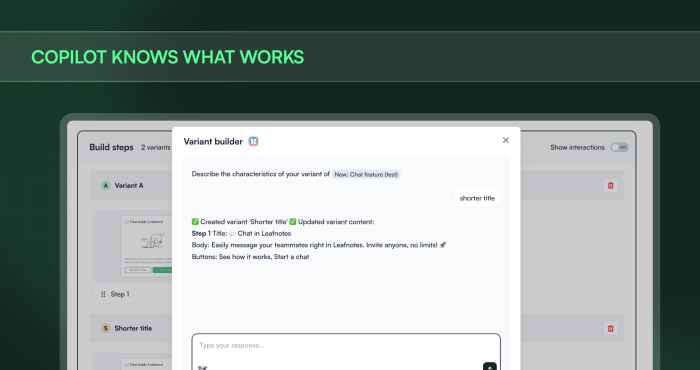 Copilot builds variants trained on what actually performs. Companies view surfaces account data you can use. Demo events trigger contextual in-apps. And when you're stuck, Copilot diagnoses your setup and unblocks you.
