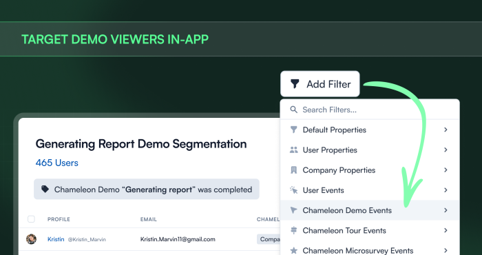 Now you can. Demo events (started, completed) are available as segmentation filters. That means you can target users based on what they showed interest in and follow up in your product. Finished your Enterprise Demo but haven't started a trial? Show them a personalized onboarding checklist when they log in next. Engaged with your API walkthrough? Trigger a tooltip highlighting your developer docs the moment they visit that page.