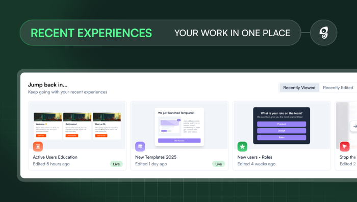The carousel adapts to your behavior. Working on three Tours simultaneously? They appear first. Haven't touched a Microsurvey in two weeks? It drops down naturally. Simple logic that eliminates dozens of clicks per week.