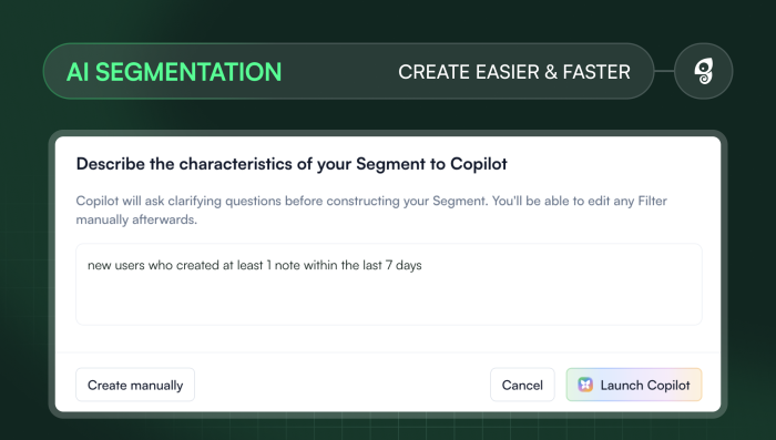 When defining audiences, describe them conversationally: "trial users in their first week who haven't completed setup" or "power users who've connected x integration." Copilot translates plain English into functional segments with the right filters and logic. No dropdown menus. No memorizing property names. No nested AND/OR logic puzzles.