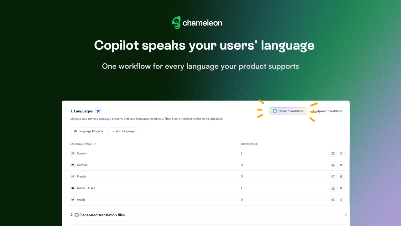 Copilot now generates translation files directly from the Localization page. Select the Experiences that need translating, and Copilot produces translation files for every language you've configured. You can download the files to review on your own timeline, or auto-upload to apply translations directly.