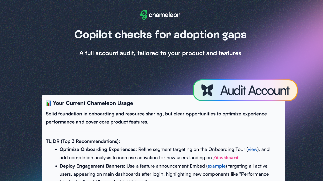 Every Chameleon account has blind spots: Experiences that quietly underperform, features with zero in-app guidance, opportunities you're missing. Copilot now catches what a great CSM would. It knows your product, your features, and how you're using Chameleon. Ask it to audit your account and it comes back with recommendations specific to your setup and product.