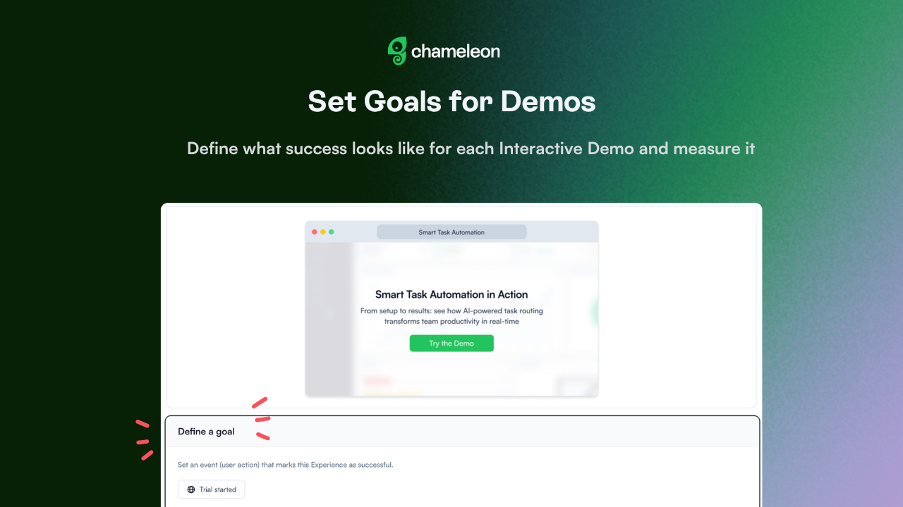 Built a Demo to get someone to that 'aha' moment? Now you'll know if they got there. Completions tell you someone finished your Interactive Demo, and Goals tell you whether it actually worked. You can now define a specific success metric for each Demo, whether that's completing it or performing a particular event, and track it in your Chameleon Dashboard.