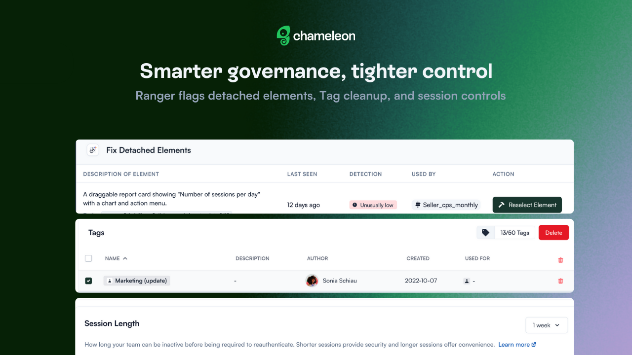 Admins can now control session length for teammates logging into Chameleon. This helps teams reduce risk from long-running sessions, align with internal security policies, and keep access intentional, without disrupting day-to-day work.